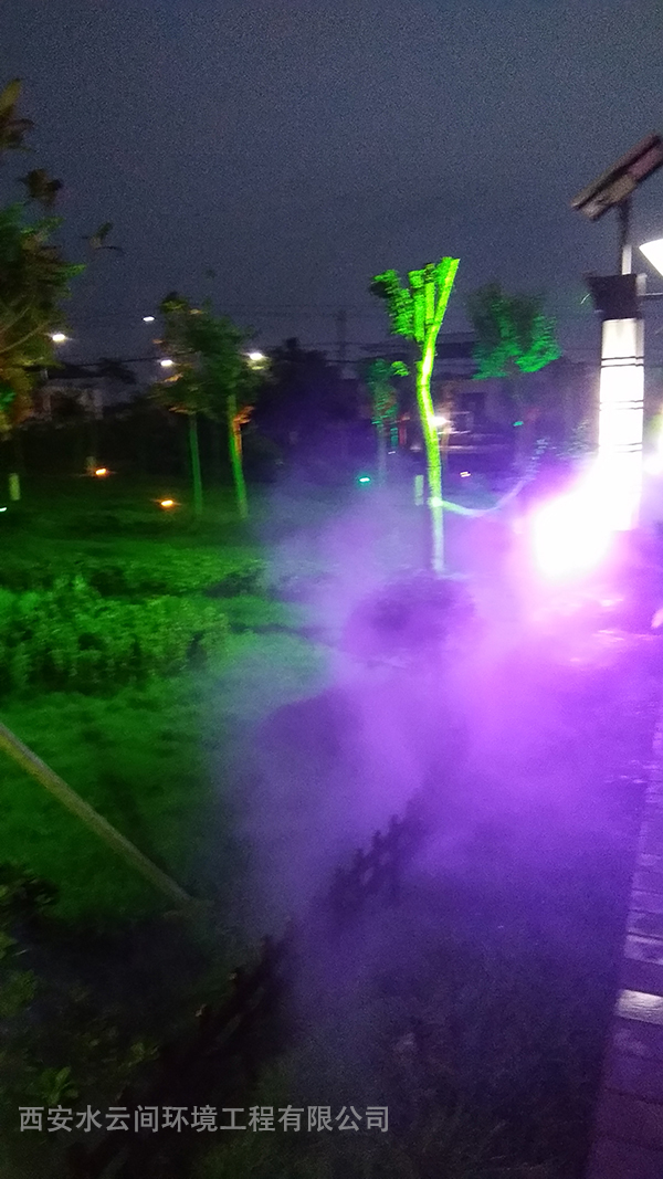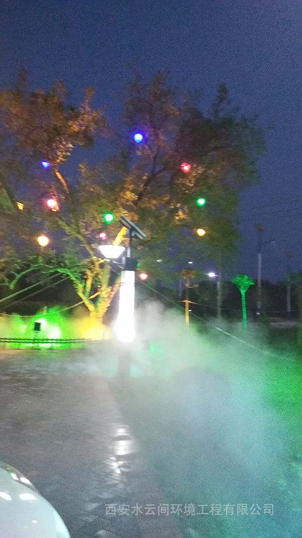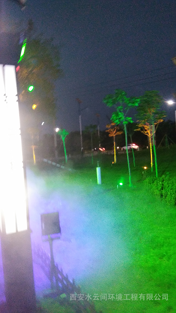 我公司為閻良文化廣場設計安裝噴霧造景系統(tǒng)+亮化燈光。噴霧系統(tǒng)不僅可以造景,而且水霧輕盈飄逸,兼具降溫、凈化空氣減少霧霾的作用。霧效在彩色燈光的映襯下出現(xiàn)彩色的霧氣,大大提升了廣場的景觀觀賞性。