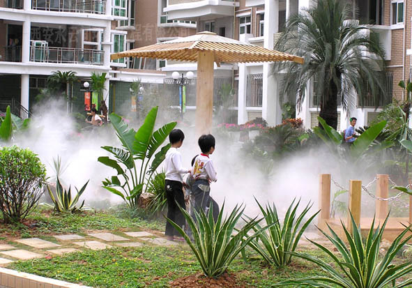 戶外空間環(huán)境降溫系統(tǒng),可以局部地控制大環(huán)境的溫度。人造霧降溫系統(tǒng)散發(fā)到空氣中的水微粒,在汽化的過程中要吸收大量周圍環(huán)境中的熱量,蒸發(fā)冷卻從而降低周圍環(huán)境溫度的原理,是戶外防暑降溫的有效手段。