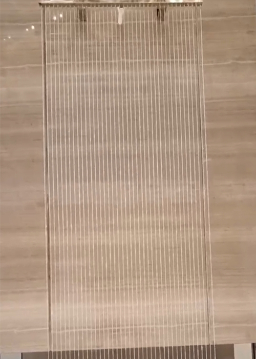 ,制作過(guò)程是將一根根光纖固定于水槽中,水體沿著線(聚酯線或通體導(dǎo)光光纖)流動(dòng),構(gòu)成了無(wú)聲的